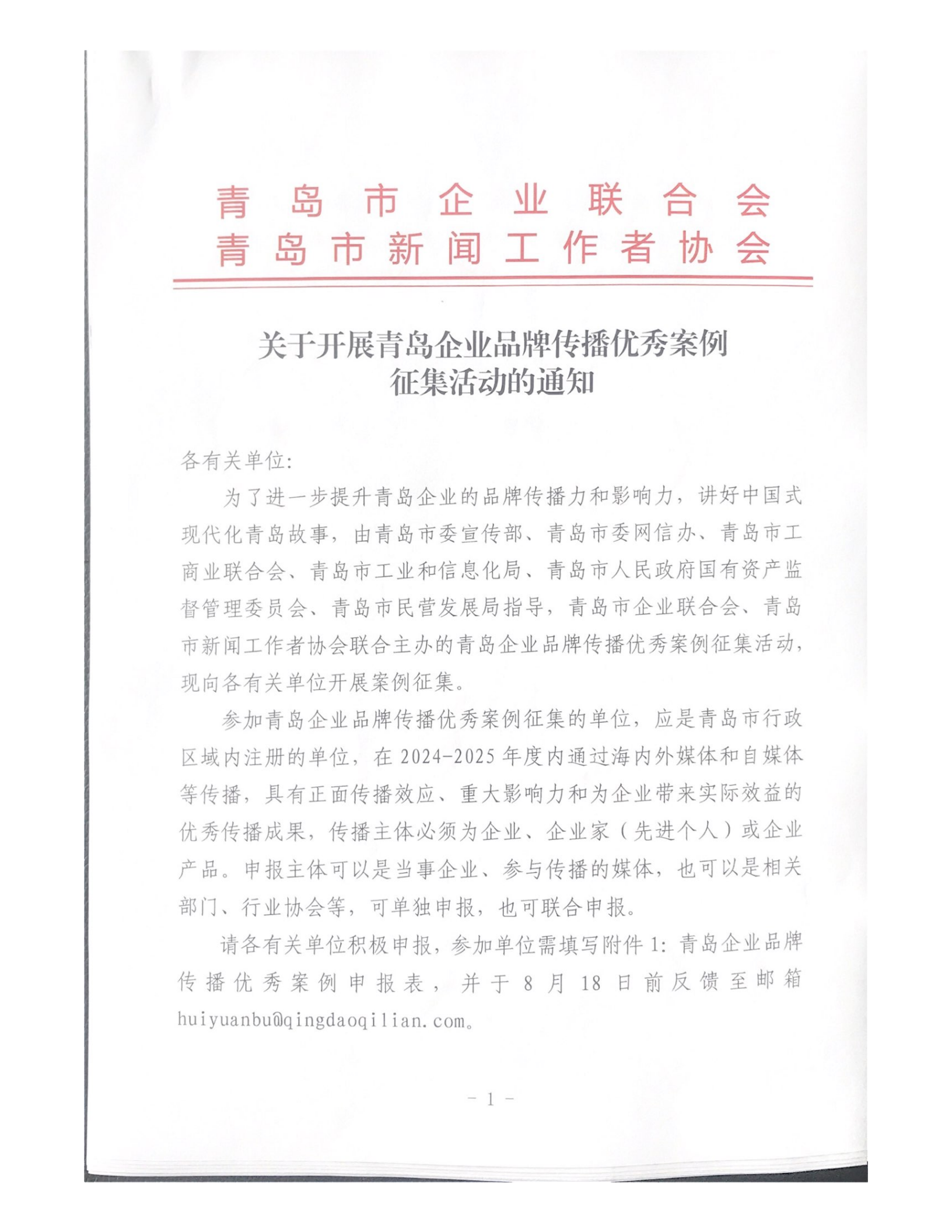 為深度挖掘我市“品牌之都”背后的精彩故事,廣泛傳播青島企業(yè)在品牌塑造與傳播領域的卓越實踐與創(chuàng)新智慧,助力青島品牌建設再攀高峰,青島市企業(yè)聯(lián)合會、青島市新聞工作者協(xié)會日前聯(lián)合向全市發(fā)出通知,啟動“青島企業(yè)品牌傳播優(yōu)秀案例”征集活動,誠邀全市相關單位踴躍參與,分享企業(yè)品牌傳播的精彩故事與豐碩成果!